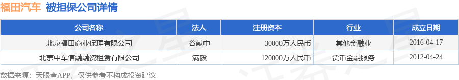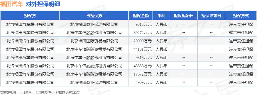 福田汽车12月15日披露8笔对外担保,被担保公司3家。对外担保明细如下表: