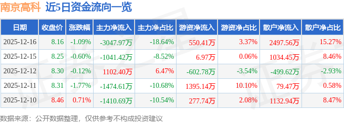 证券之星消息,截至2025年12月16日收盘,南京高科(600064)报收于8.16元,下跌1.09%,换手率1.16%,成交量19.99万手,成交额1.64亿元。
