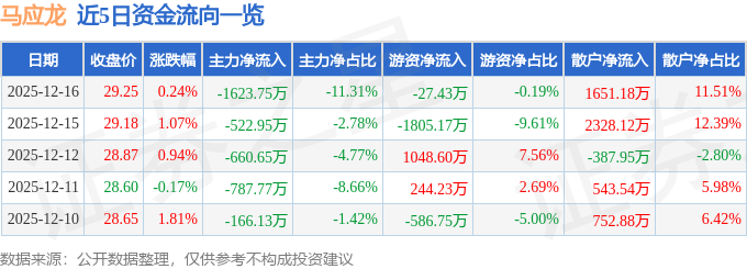 证券之星消息,截至2025年12月16日收盘,马应龙(600993)报收于29.25元,上涨0.24%,换手率1.15%,成交量4.93万手,成交额1.44亿元。