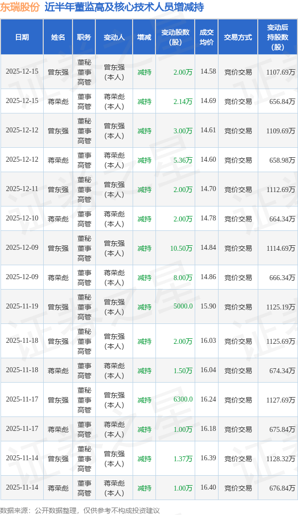 东瑞股份近半年内的董监高及核心技术人员增减持详情如下: