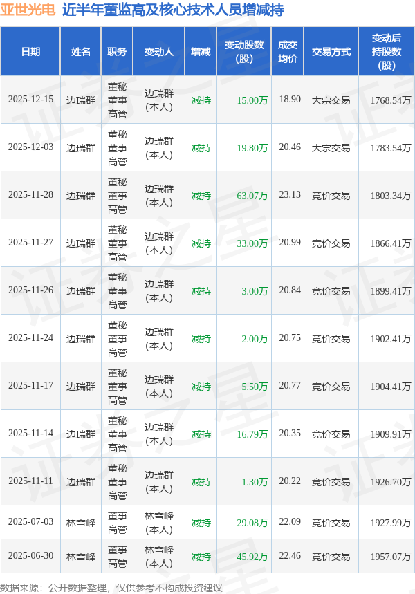 亚世光电近半年内的董监高及核心技术人员增减持详情如下: