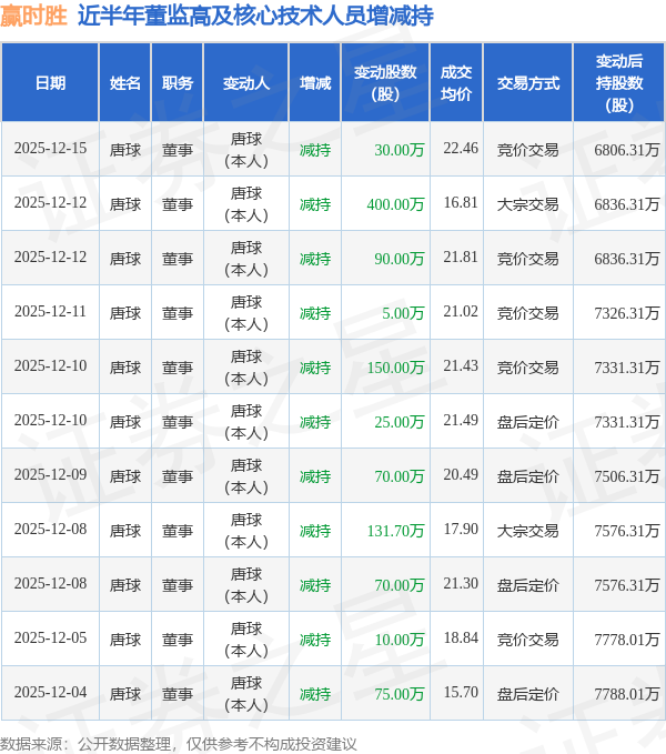 赢时胜近半年内的董监高及核心技术人员增减持详情如下: