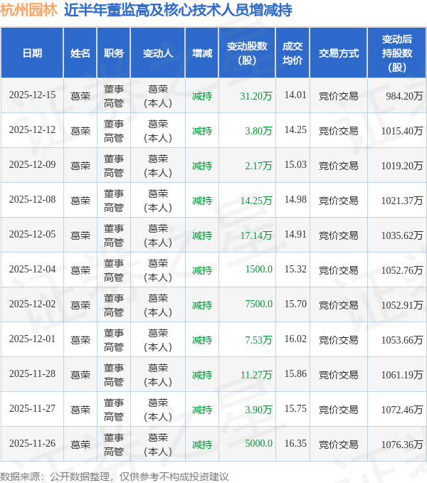 杭州园林近半年内的董监高及核心技术人员增减持详情如下: