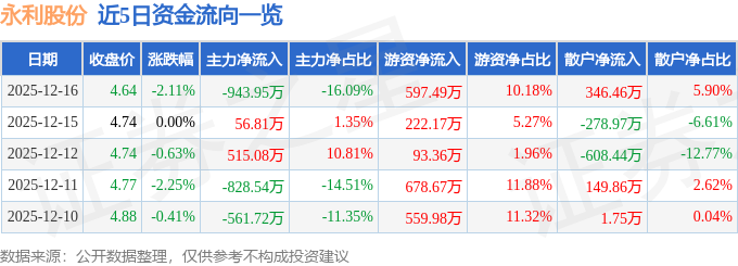 12月16日的资金流向数据方面,主力资金净流出943.95万元,占总成交额16.09%,游资资金净流入597.49万元,占总成交额10.18%,散户资金净流入346.46万元,占总成交额5.9%。