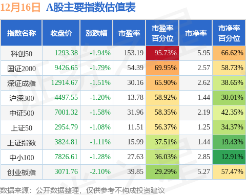 A股主要宽基指数方面,科创50的市盈率百分位较高,为95.73%。而创业板指的市盈率百分位较低,为29.29%。