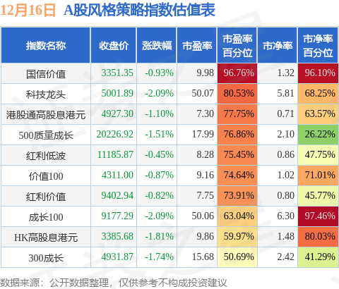 风格策略指数方面,国信价值的市盈率百分位较高,为96.76%。而300成长的市盈率百分位较低,为50.69%。