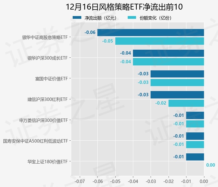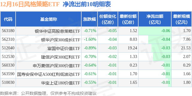 当日有7只风格策略ETF基金出现资金净流出,其中净流出排首位的是银华中证高股息策略ETF(563180),份额减少了500.0万份,净流出额为556.84万元。