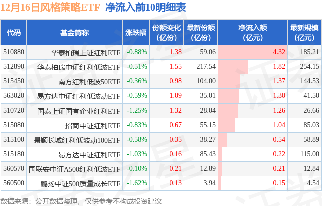 当日有21只风格策略ETF基金出现资金净流入,其中净流入排首位的是华泰柏瑞上证红利ETF(510880),份额增加了1.38亿份,净流入额为4.32亿元。
