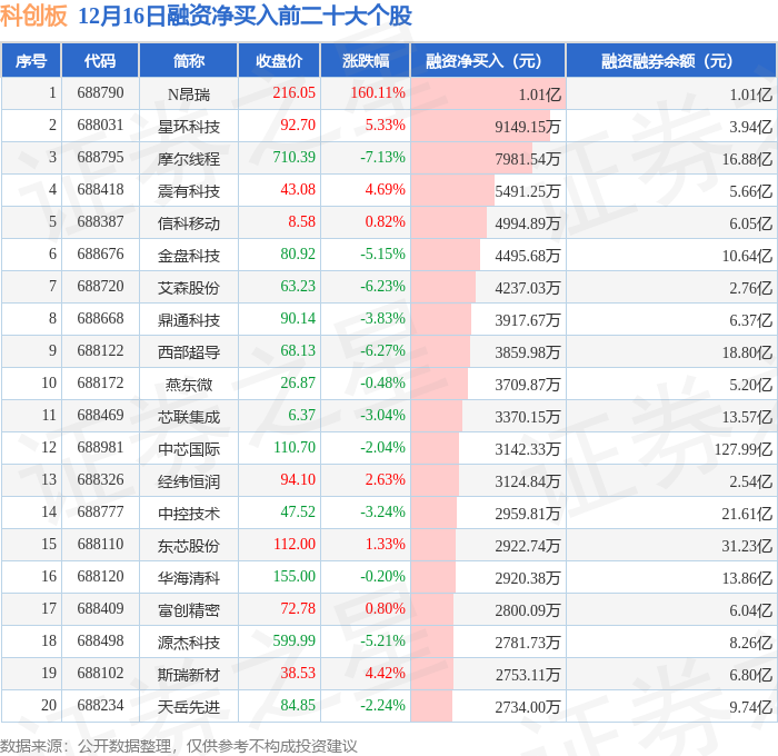科创板融资净买入前三分别为:N昂瑞(688790)融资净买入1.01亿元、星环科技(688031)融资净买入9149.15万元、摩尔线程(688795)融资净买入7981.54万元,前20具体见下表: