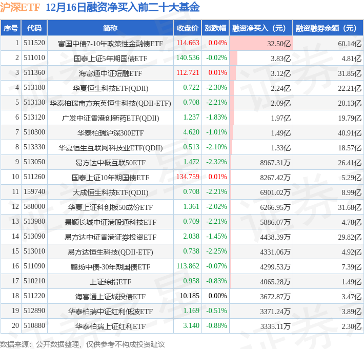 沪深ETF融资净买入前三分别为:富国中债7-10年政策性金融债ETF(511520)融资净买入32.5亿元、国泰上证5年期国债ETF(511010)融资净买入3.83亿元、海富通中证短融ETF(511360)融资净买入3.12亿元,前20具体见下表: