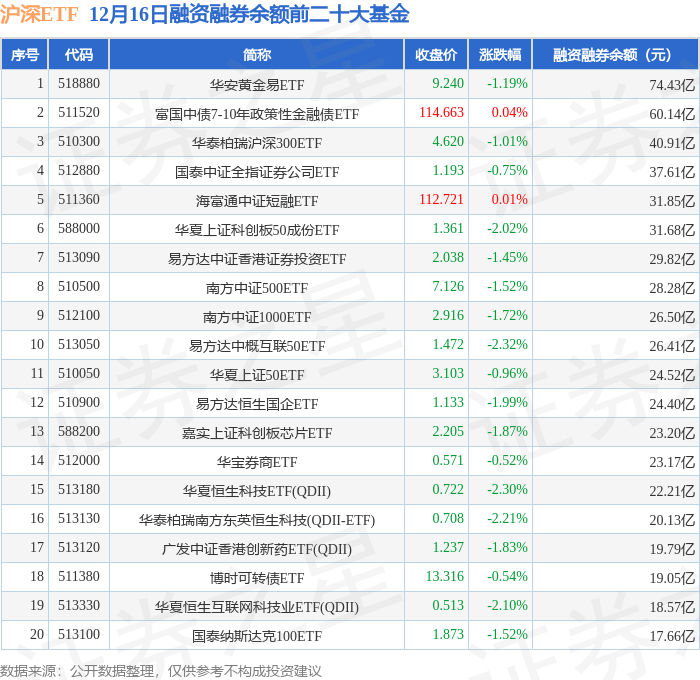 沪深ETF融资融券余额前三分别为:华安黄金易ETF(518880)融资融券余额74.43亿元、富国中债7-10年政策性金融债ETF(511520)融资融券余额60.14亿元、华泰柏瑞沪深300ETF(510300)融资融券余额40.91亿元,前20具体见下表: