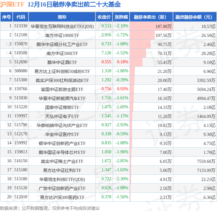 沪深ETF融券净卖出前三分别为:华夏恒生互联网科技业ETF(QDII)(513330)融券净卖出187.88万股、南方中证1000ETF(512100)融券净卖出107.56万股、鹏华中证细分化工产业ETF(159870)融券净卖出90.75万股,前20具体见下表:
