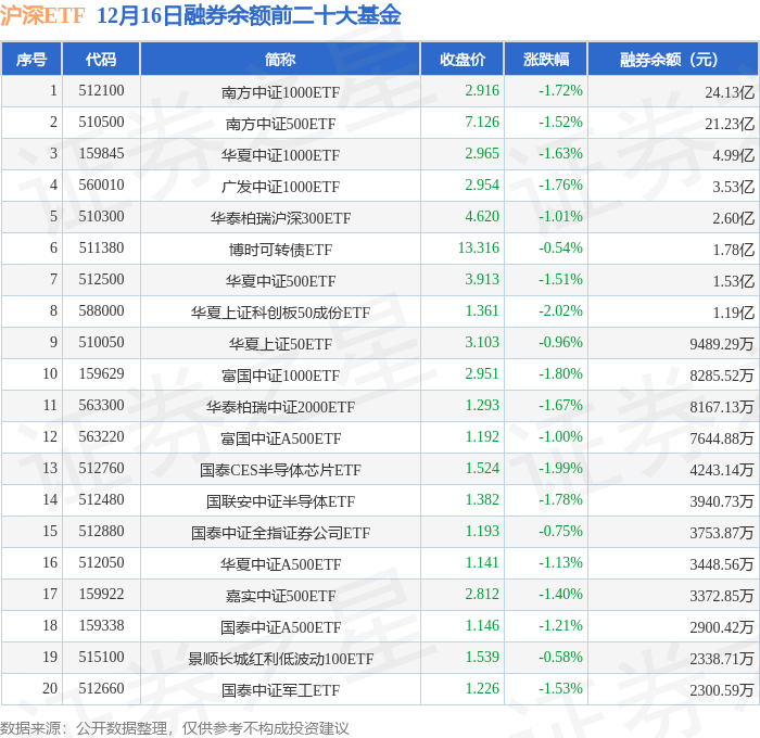 沪深ETF融券余额前三分别为:南方中证1000ETF(512100)融券余额24.13亿元、南方中证500ETF(510500)融券余额21.23亿元、华夏中证1000ETF(159845)融券余额4.99亿元,前20具体见下表: