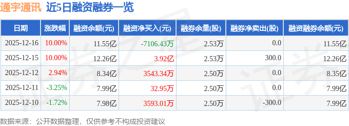 通宇通讯融资融券信息显示,融资方面,当日融资买入2.05亿元,融资偿还2.76亿元,融资净偿还7106.43万元。融券方面,融券卖出0.0股,融券偿还0.0股,融券余量2.53万股,融券余额89.08万元。融资融券余额11.55亿元。