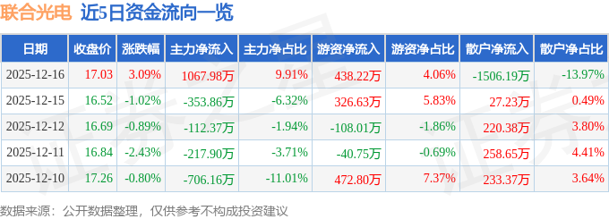 证券之星消息,截至2025年12月16日收盘,联合光电(300691)报收于17.03元,上涨3.09%,换手率2.9%,成交量6.41万手,成交额1.08亿元。