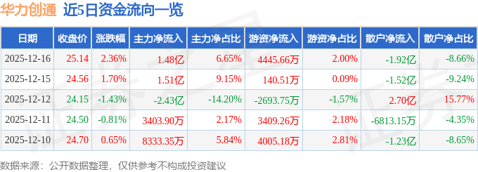 证券之星消息,截至2025年12月16日收盘,华力创通(300045)报收于25.14元,上涨2.36%,换手率17.34%,成交量89.53万手,成交额22.18亿元。
