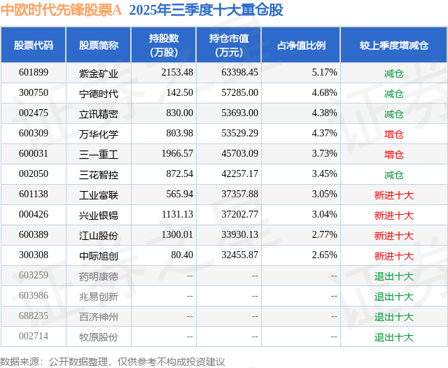 根据2025基金Q3季报公募基金重仓股数据,重仓该股的公募基金共25家,其中持有数量最多的公募基金为中欧基金的中欧时代先锋股票A。中欧时代先锋股票A目前规模为100.69亿元,最新净值1.8543(12月16日),较上一交易日下跌1.5%,近一年上涨45.53%。该公募基金现任基金经理为周蔚文 罗佳明。周蔚文在任的基金产品包括:中欧新蓝筹混合A,管理时间为2011年5月23日至今,期间收益率为534.73%;中欧精选定期开放混合A,管理时间为2016年12月1日至今,期间收益率为200.94%;中欧新趋势混合C,管理时间为2018年3月21日至今,期间收益率为120.91%;中欧匠心两年持有期混合A,管理时间为2019年6月11日至今,期间收益率为77.79%。罗佳明在任的基金产品包括:中欧丰泓沪港深混合A,管理时间为2019年7月2日至今,期间收益率为62.12%;中欧丰泰港股通混合A,管理时间为2022年9月14日至今,期间收益率为67.6%;中欧价值品质混合发起A,管理时间为2024年11月5日至今,期间收益率为34.02%。