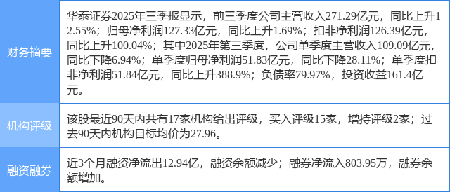 2025年11月2日,开源证券研究员高超,卢崑发布了对华泰证券的研报《华泰证券2025三季报点评:业绩超预期,综合实力行业领先》,该研报对华泰证券给出“买入”评级。研报中预计2025-2027年公司归母净利润168/217/251亿元,同比+9%/+29%/+16%(对应2025年扣非归母净利润同比+85%),对应PE为11.7/9.0/7.8倍,当前PB(LF)1.14倍,公司业务综合实力强,AI涨乐APP上线引领行业,维持“买入”评级。证券之星数据中心根据近三年发布的研报数据计算,该研报作者对此股的盈利预测准确度为80.98%。