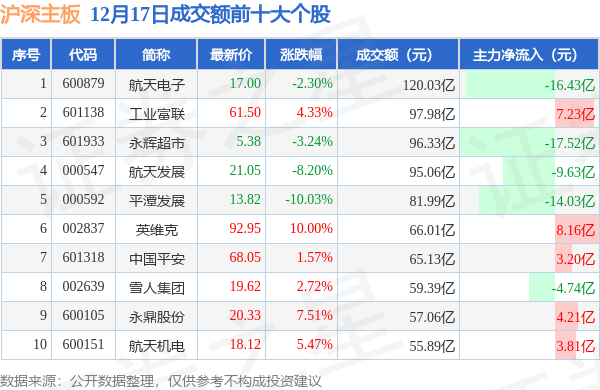 当日沪深主板成交额前10大个股中6只个股收涨,平均涨幅5.27%,其中航天电子(600879)以成交额120.03亿元排第一。从主力资金流入看,成交额前10大个股中有5只个股呈现主力资金净流入。