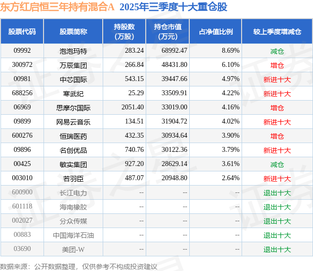根据2025基金Q3季报公募基金重仓股数据,重仓该股的公募基金共43家,其中持有数量最多的公募基金为东方红资产管理的东方红启恒三年持有混合A。东方红启恒三年持有混合A目前规模为7.18亿元,最新净值10.3877(12月16日),较上一交易日下跌1.6%,近一年上涨11.36%。该公募基金现任基金经理为胡晓 李竞。李竞在任的基金产品包括:东方红启东三年持有混合,管理时间为2020年3月16日至今,期间收益率为53.84%;东方红启航三年持有混合A,管理时间为2020年10月29日至今,期间收益率为4.67%;东方红睿和三年持有混合A,管理时间为2021年12月2日至今,期间收益率为-16.08%;东方红ESG可持续投资混合A,管理时间为2022年3月2日至今,期间收益率为0.87%。胡晓在任的基金产品包括:东方红启兴三年持有混合A,管理时间为2024年2月8日至今,期间收益率为42.87%;东方红睿满沪港深混合(LOF)A,管理时间为2024年4月27日至今,期间收益率为36.43%;东方红港股通价值优选混合发起A,管理时间为2025年6月17日至今,期间收益率为5.07%。