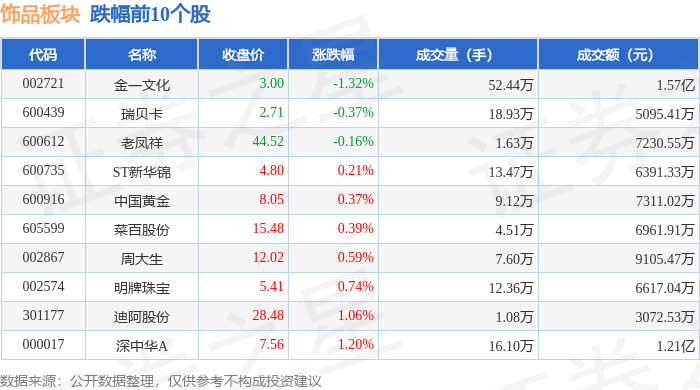 从资金流向上来看,当日饰品板块主力资金净流出3181.86万元,游资资金净流出1288.84万元,散户资金净流入4470.7万元。饰品板块个股资金流向见下表: