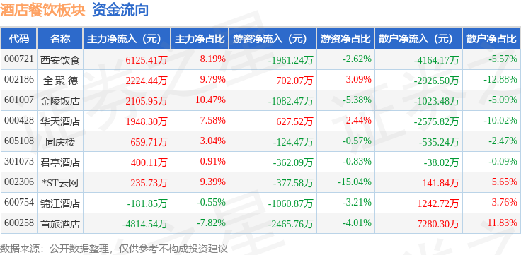 从资金流向上来看,当日酒店餐饮板块主力资金净流入8703.26万元,游资资金净流出6104.9万元,散户资金净流出2598.37万元。酒店餐饮板块个股资金流向见下表: