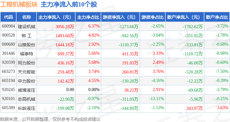 从资金流向上来看,当日工程机械板块主力资金净流出3.91亿元,游资资金净流出2.38亿元,散户资金净流入6.29亿元。工程机械板块个股资金流向见下表: