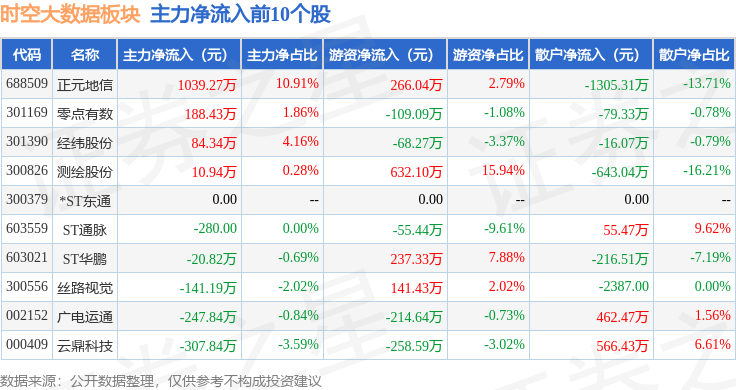 从资金流向上来看,当日时空大数据板块主力资金净流出10.63亿元,游资资金净流入6546.65万元,散户资金净流入9.97亿元。时空大数据板块个股资金流向见下表: