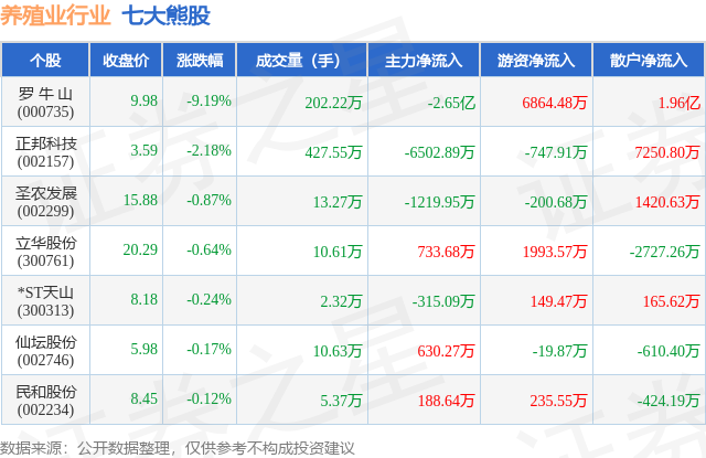 个股表现方面,养殖业行业当日领跌股为罗 牛 山(000735),该股当日报收9.98,下跌9.19%,成交量202.22万,主力资金净流出2.65亿元。正邦科技(002157)以下跌2.18%紧随其后,该股当日成交量427.55万,主力资金净流出6502.89万元。除此之外,圣农发展(002299)、立华股份(300761)、*ST天山(300313)均进入当日熊股之列。具体个股列表见下表:
