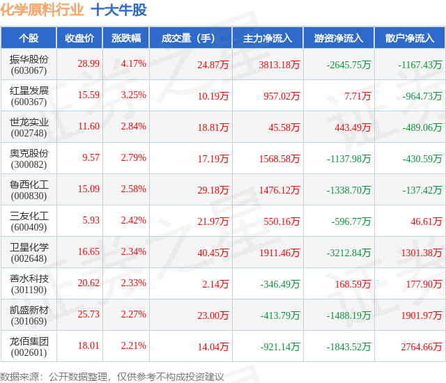 个股表现方面,化学原料行业当日领涨股为振华股份(603067),该股当日报收28.99,上涨4.17%,成交量24.87万,主力资金净流入3813.18万元。红星发展(600367)以上涨3.25%紧随其后,该股当日成交量10.19万,主力资金净流入957.02万元。除此之外,世龙实业(002748)、奥克股份(300082)、鲁西化工(000830)均进入当日牛股之列。具体个股列表见下表: