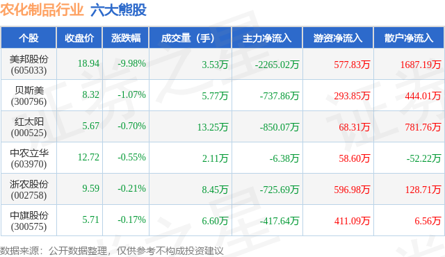 个股表现方面,农化制品行业当日领跌股为美邦股份(605033),该股当日报收18.94,下跌9.98%,成交量3.53万,主力资金净流出2265.02万元。贝斯美(300796)以下跌1.07%紧随其后,该股当日成交量5.77万,主力资金净流出737.86万元。除此之外,红太阳(000525)、中农立华(603970)、浙农股份(002758)均进入当日熊股之列。具体个股列表见下表: