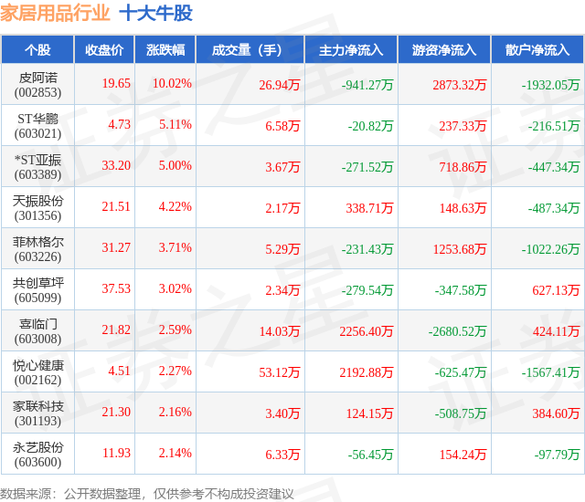 个股表现方面,家居用品行业当日领涨股为皮阿诺(002853),该股当日报收19.65,上涨10.02%,成交量26.94万,主力资金净流出941.27万元。ST华鹏(603021)以上涨5.11%紧随其后,该股当日成交量6.58万,主力资金净流出20.82万元。除此之外,*ST亚振(603389)、天振股份(301356)、菲林格尔(603226)均进入当日牛股之列。具体个股列表见下表: