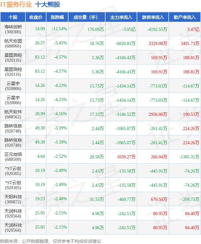 个股表现方面,IT服务行业当日领跌股为海峡创新(300300),该股当日报收14.09,下跌12.54%,成交量176.69万,主力资金净流出3.05亿元。航天宏图(688066)以下跌5.41%紧随其后,该股当日成交量18.76万,主力资金净流出6820.81万元。除此之外,星图测控(920116)、星图测控(920116)、云星宇(920806)均进入当日熊股之列。具体个股列表见下表: