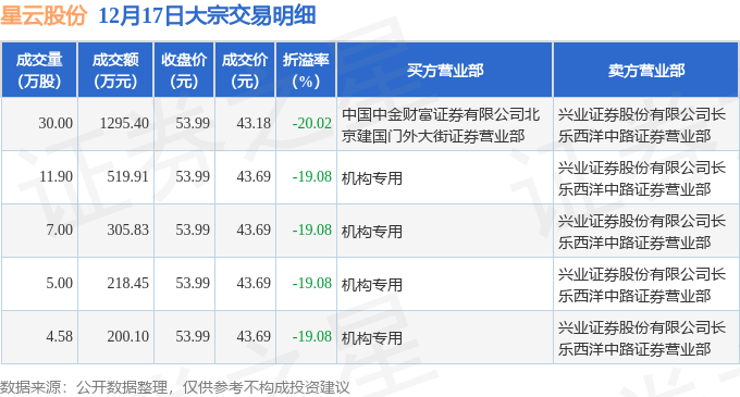 证券之星消息,12月17日星云股份发生大宗交易,交易数据如下: