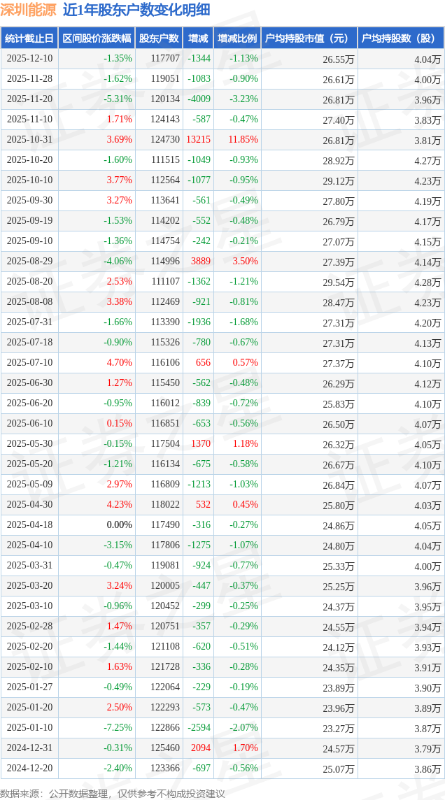 从股价来看,2025年11月28日至2025年12月10日,深圳能源区间跌幅为1.35%,在此期间股东户数减少1344.0户,减幅为1.13%。