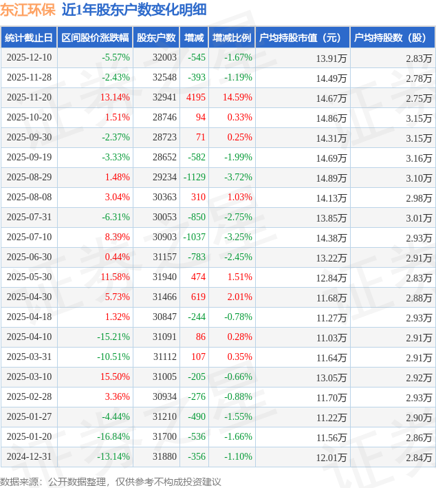 证券之星消息,近日东江环保披露,截至2025年12月10日公司股东户数为3.2万户,较11月28日减少545.0户,减幅为1.67%。户均持股数量由上期的2.78万股增加至2.83万股,户均持股市值为13.91万元。