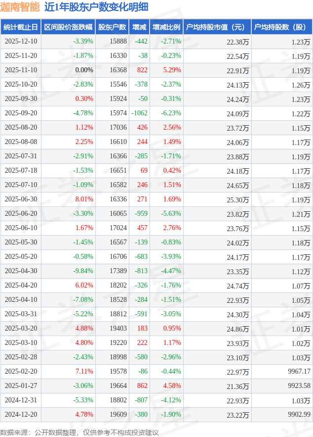 从股价来看,2025年11月20日至2025年12月10日,迦南智能区间跌幅为3.39%,在此期间股东户数减少442.0户,减幅为2.71%。