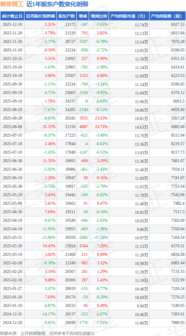 从股价来看,2025年11月28日至2025年12月10日,德恩精工区间涨幅为3.31%,在此期间股东户数减少347.0户,减幅为1.61%。