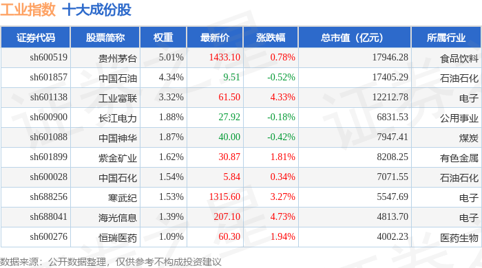 工业指数(000004)十大成份股详情如下: