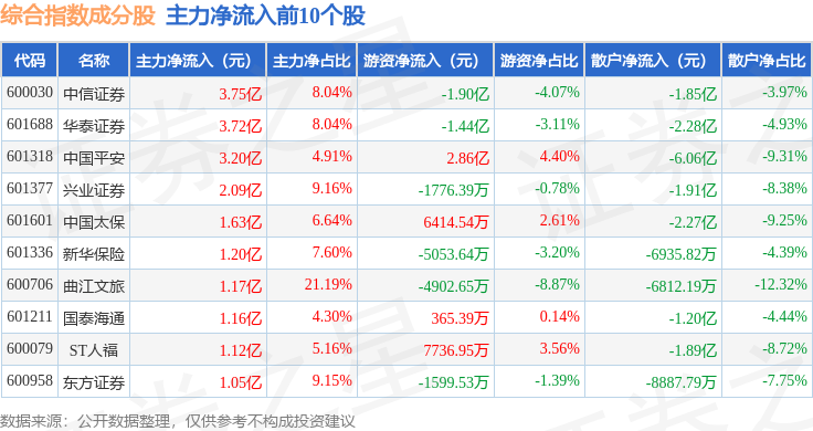 资金流向方面,综合指数(000008)成份股当日主力资金净流出合计2.47亿元,游资资金净流出合计2.81亿元,散户资金净流入合计5.28亿元。成份股资金流向详情见下表: