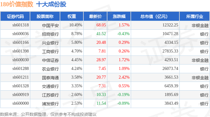 证券之星消息,12月17日,180价值(000029)指数报收于4403.99点,涨0.86%,成交622.06亿元,换手率0.29%。当日该指数成份股中,上涨的有43家,华泰证券以6.09%的涨幅领涨,下跌的有14家,四川路桥以1.4%的跌幅领跌。