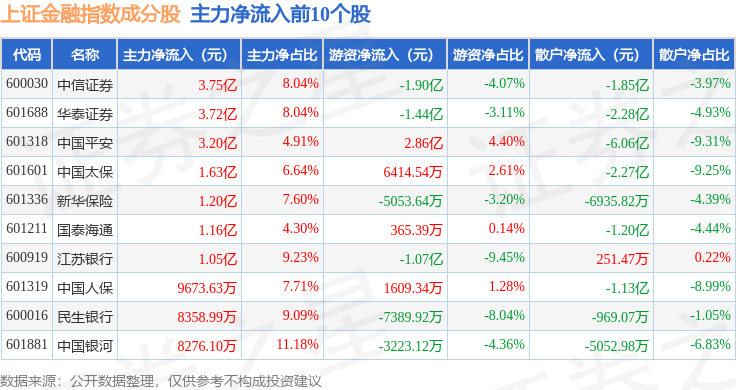 资金流向方面,上证金融(000038)指数成份股当日主力资金净流入合计19.45亿元,游资资金净流出合计4.53亿元,散户资金净流出合计14.92亿元。成份股资金流向详情见下表: