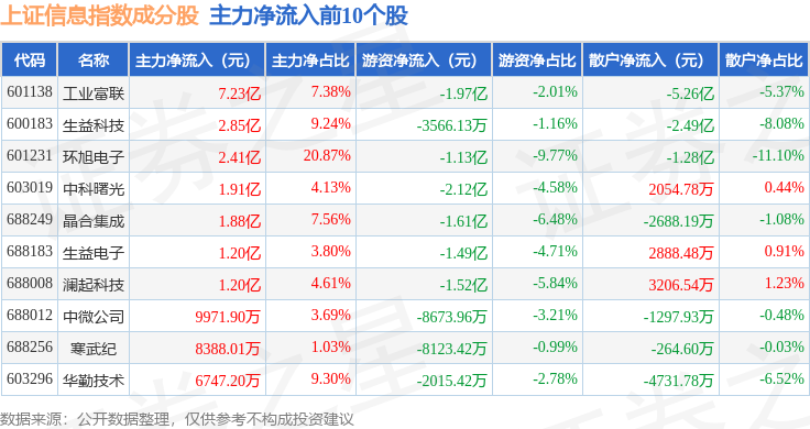 资金流向方面,上证信息(000039)指数成份股当日主力资金净流入合计10.24亿元,游资资金净流出合计13.92亿元,散户资金净流入合计3.68亿元。成份股资金流向详情见下表: