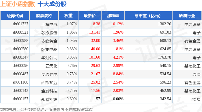 上证小盘(000045)指数十大成份股详情如下: