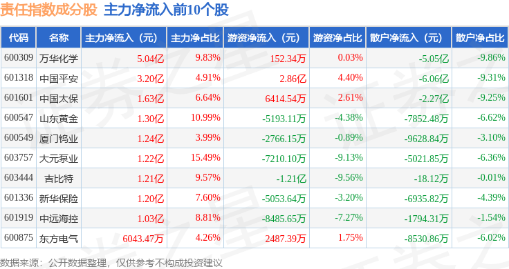 资金流向方面,责任指数(000048)成份股当日主力资金净流入合计4.12亿元,游资资金净流出合计1.46亿元,散户资金净流出合计2.66亿元。成份股资金流向详情见下表: