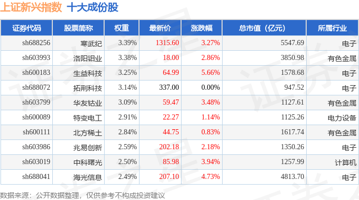 证券之星消息,12月17日,上证新兴(000067)指数报收于8602.95点,涨1.72%,成交962.54亿元,换手率1.0%。当日该指数成份股中,上涨的有41家,万华化学以5.92%的涨幅领涨,下跌的有8家,长城汽车以0.89%的跌幅领跌。