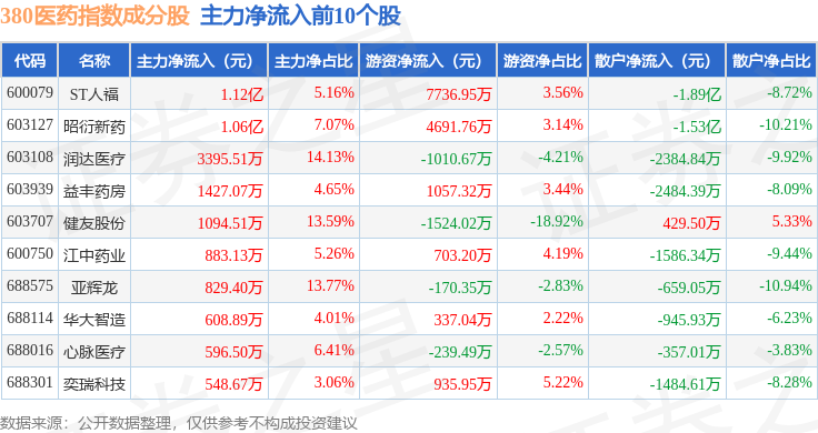 资金流向方面,380医药(000109)指数成份股当日主力资金净流入合计9442.28万元,游资资金净流入合计6969.5万元,散户资金净流出合计1.64亿元。成份股资金流向详情见下表: