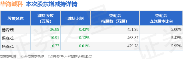 证券之星消息,12月17日华海诚科发布公告《华海诚科:江苏华海诚科新材料股份有限公司关于持股5%以上股东权益变动触及5%刻度的提示性公告》,其股东杨森茂于2025年11月11日至2025年12月16日间合计减持48.57万股,占公司目前总股本的0.5628%,变动期间该股股价下跌5.19%,截止12月16日收盘报102.51元。