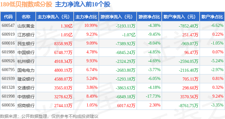 资金流向方面,180低贝(000136)指数成份股当日主力资金净流出合计8228.41万元,游资资金净流出合计5.2亿元,散户资金净流入合计6.02亿元。成份股资金流向详情见下表: