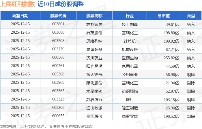 近10日内上民红利(000153)指数成份股做了调整,新纳入了6只股票,剔除了6只股票。